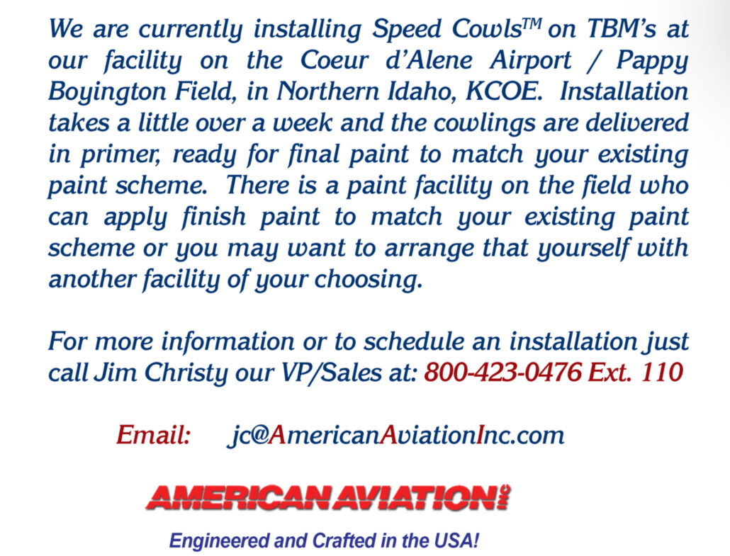 Since their introduction in 1991, the TBM 700’s and later 850’s have been known as the highest performing single engine turboprops. In 2014 Daher updated the cowling of the new TBM’s to one that offered boundary layer relief similar to cowlings developed by American Aviation Inc. in the early 2000’s for the Cheyenne and King Air models. Since then, numerous TBM owners have contacted American Aviation and asked if we could develop a ram air cowling for older TBM’s. At the time we were developing a new cowling for the Pilatus PC-12 aircraft which was certified in 2019. Shortly thereafter, American’s engineering team was tasked to look at the TBM design and see how improvements could be made to that aircraft.